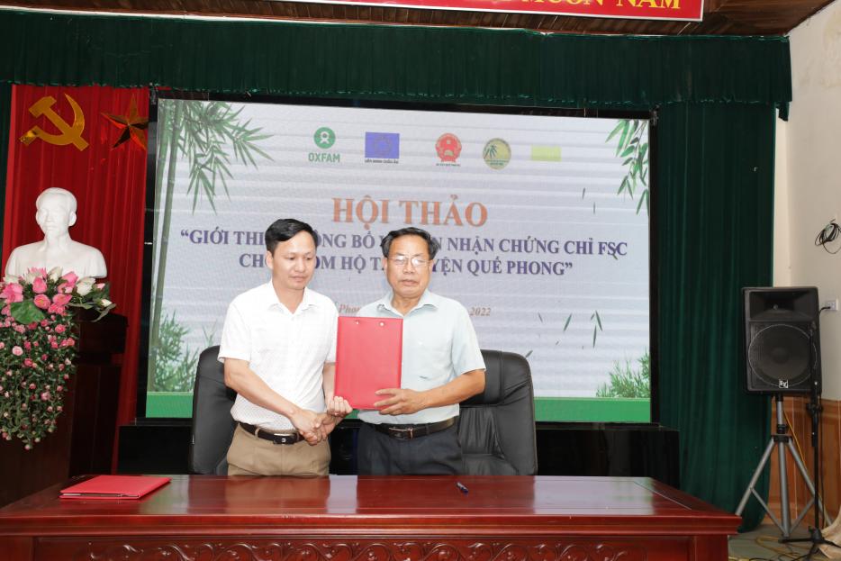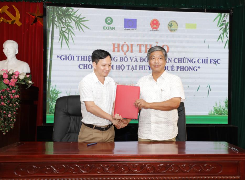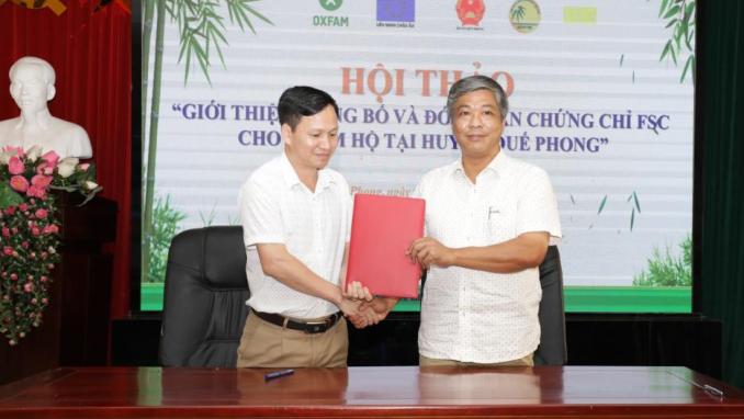 Đại diện tổ chức GFA trao chứng chỉ FSC cho ban đại diện nhóm 212 hộ dân trồng và khai thác rừng Lùng tại huyện Quế Phong
